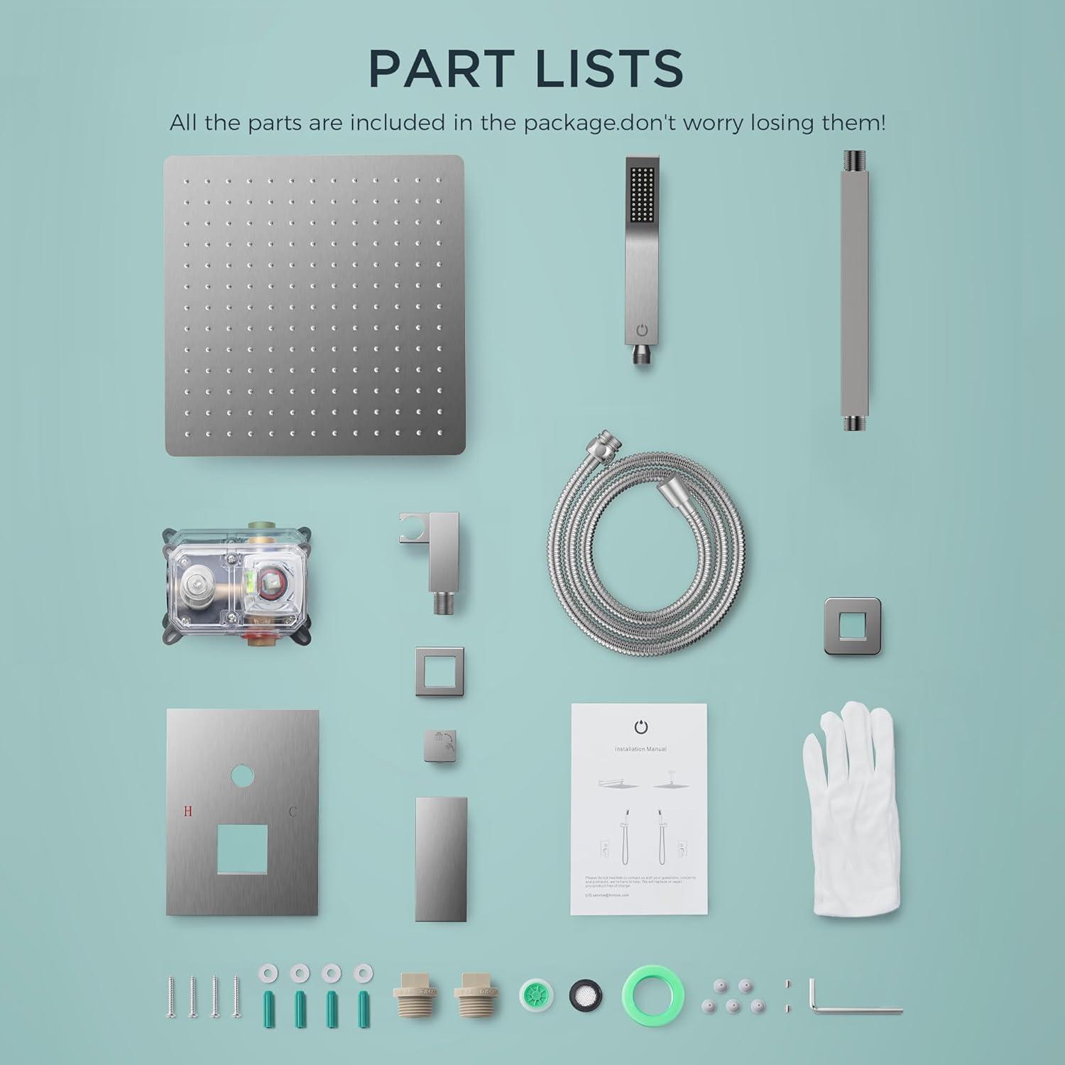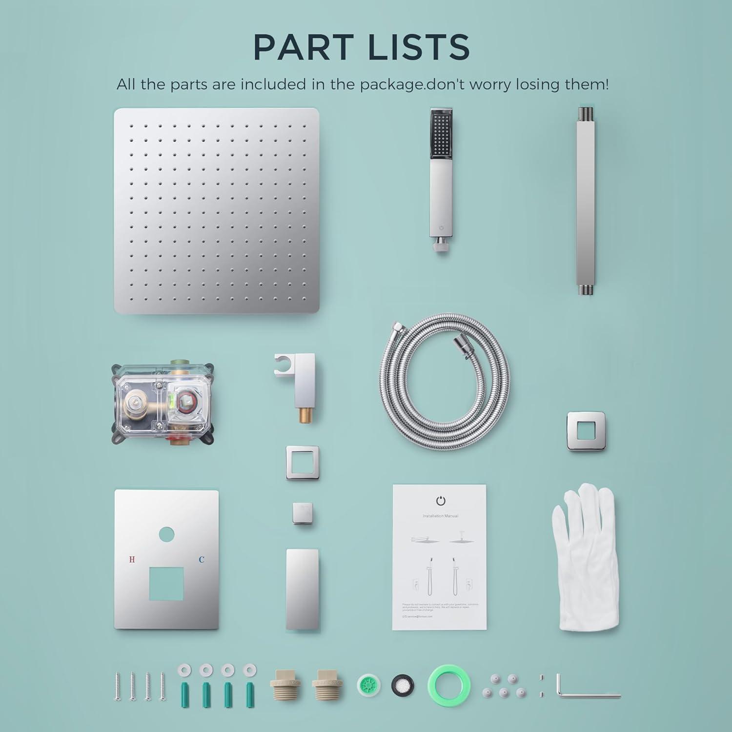 【What you will get】: 10 inch rain shower head (304 stainless steel), handheld showerhead (solid brass), 8.66 inch ceiling shower arm (304 stainless steel), rough-in valve (solid brass), shower bracket (solid brass), 59-inch shower hose (304 stainless steel), and all the necessary accessories for installation.