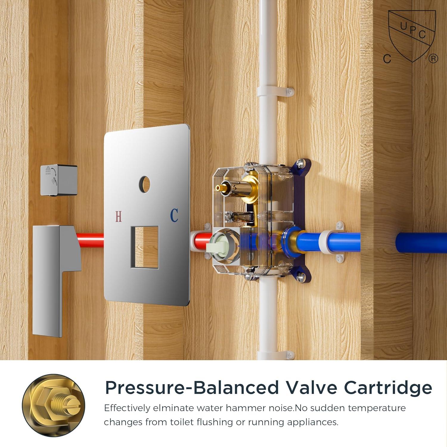 【Constant temperature】: Our shower system is made of solid brass material and come with a pressure balance valve, you can rely on a consistent water temperature with the Monitor Pressure-Balanced Valve Cartridge , so no sudden temperature changes from toilet flushes or running appliances. And our shower faucet set has passed CUPC certification, compliance with the following standard(s): ASME A112.18.1-2018/CSA B125.1-18. Plumbers will not refuse to install this shower faucet kit.