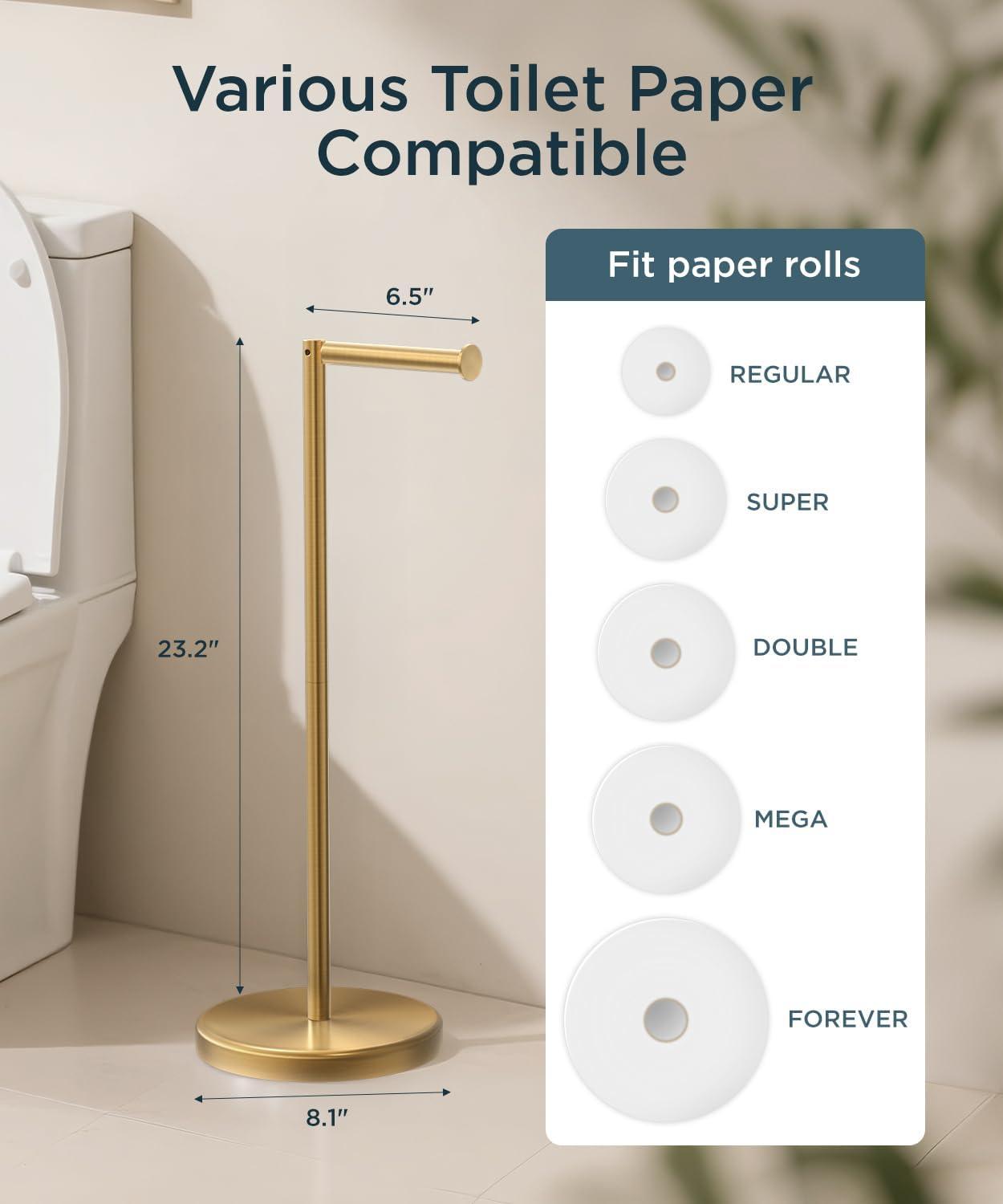 Fit Most Roll of Paper: The 6.5-inch horizontal bar fits most of roll sizes such as regular, mega, and jumbo, catering to your household's diverse needs. The height is 23.2 inches and provides ample height for easy reach. Dimension: 23.2 x 8.1x 6.5 Inch