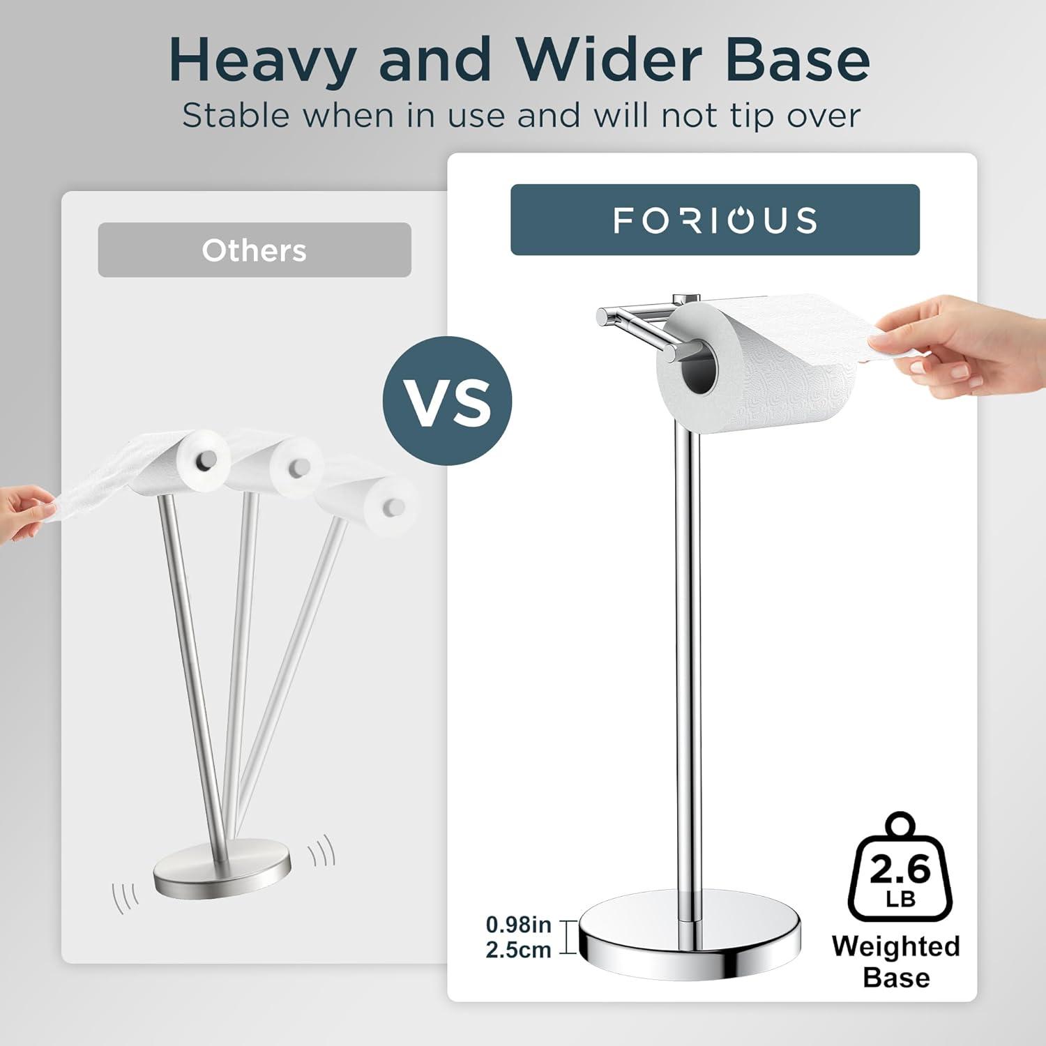 Upgraded: FORIOUS toilet paper holder uses the pivoting double-post design, the biggest advantage of which is to prevent the paper towel from slipping off, which flips up for U to put the new paper roll quickly and easily instead of the traditional squeeze together spring