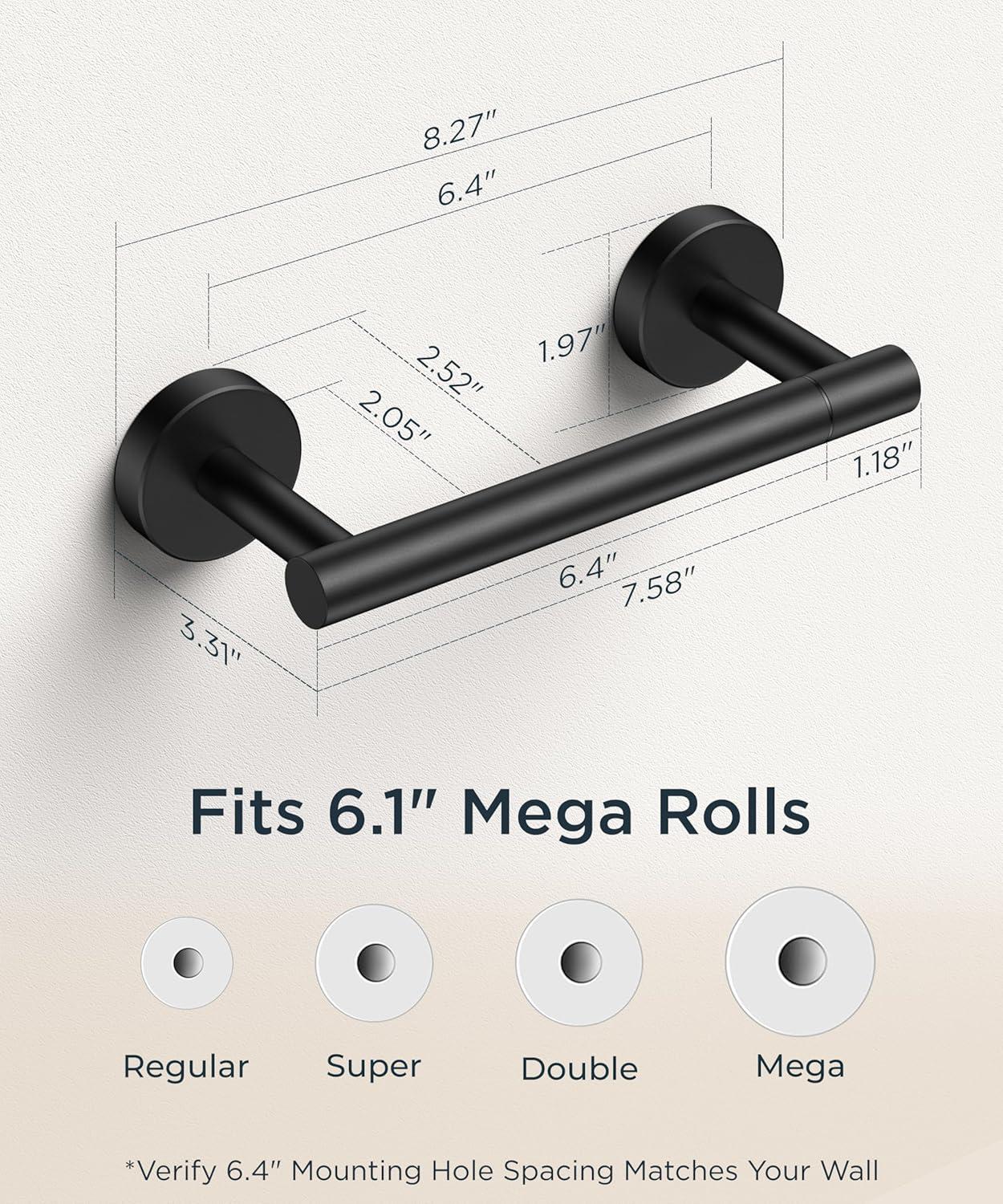 True Size: The gold toilet paper holder can accommodate large rolls with a maximum diameter of 6.1”, sufficient for daily use without being too noticeable, maximizing unused wall space. Note: Not suitable for oversized rolls > 6.1 inches in diameter