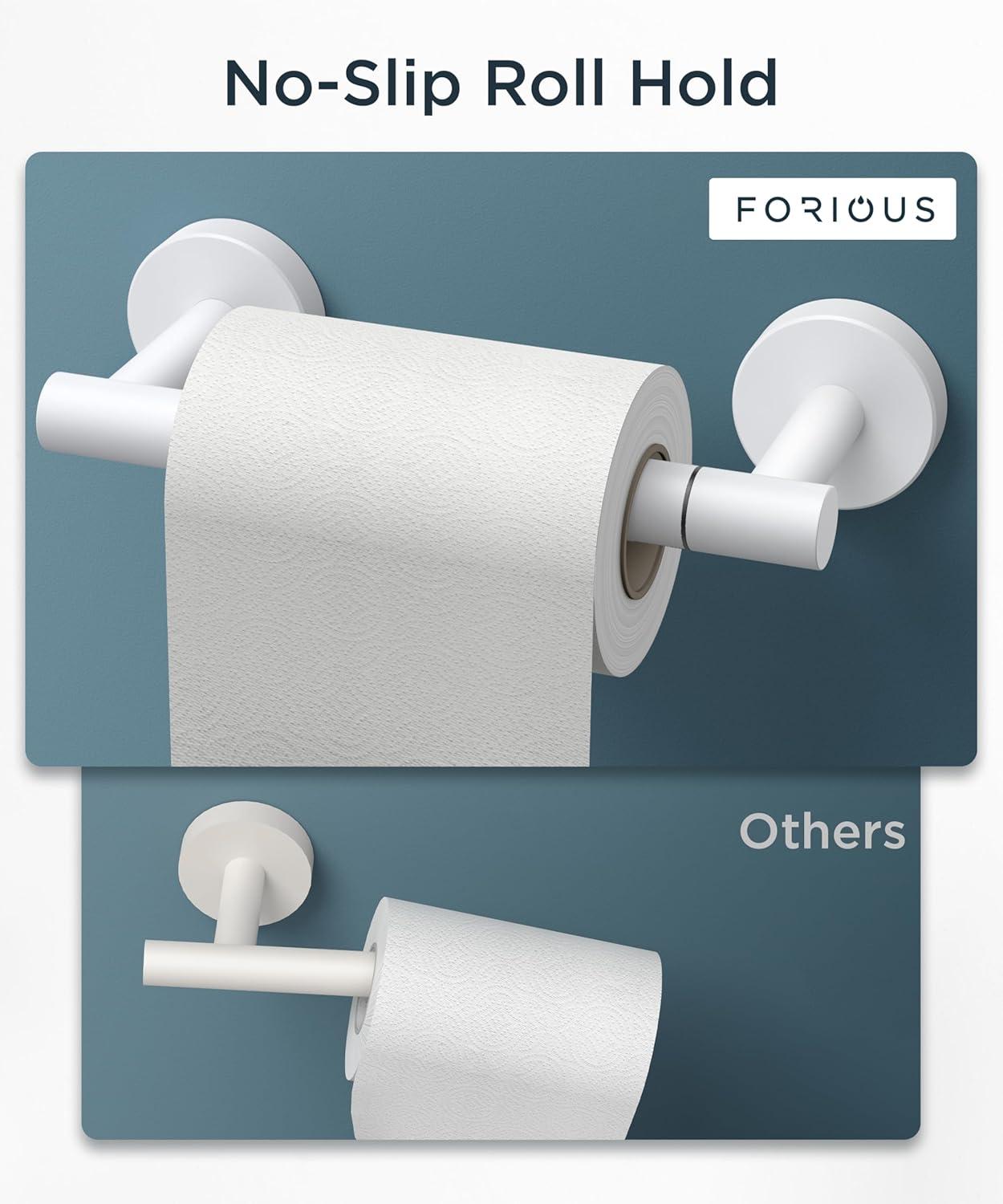 Upgraded: FORIOUS toilet paper holder uses the pivoting double-post design, the biggest advantage of which is to prevent the paper towel from slipping off, which flips up for U to put the new paper roll quickly and easily instead of the traditional squeeze together spring