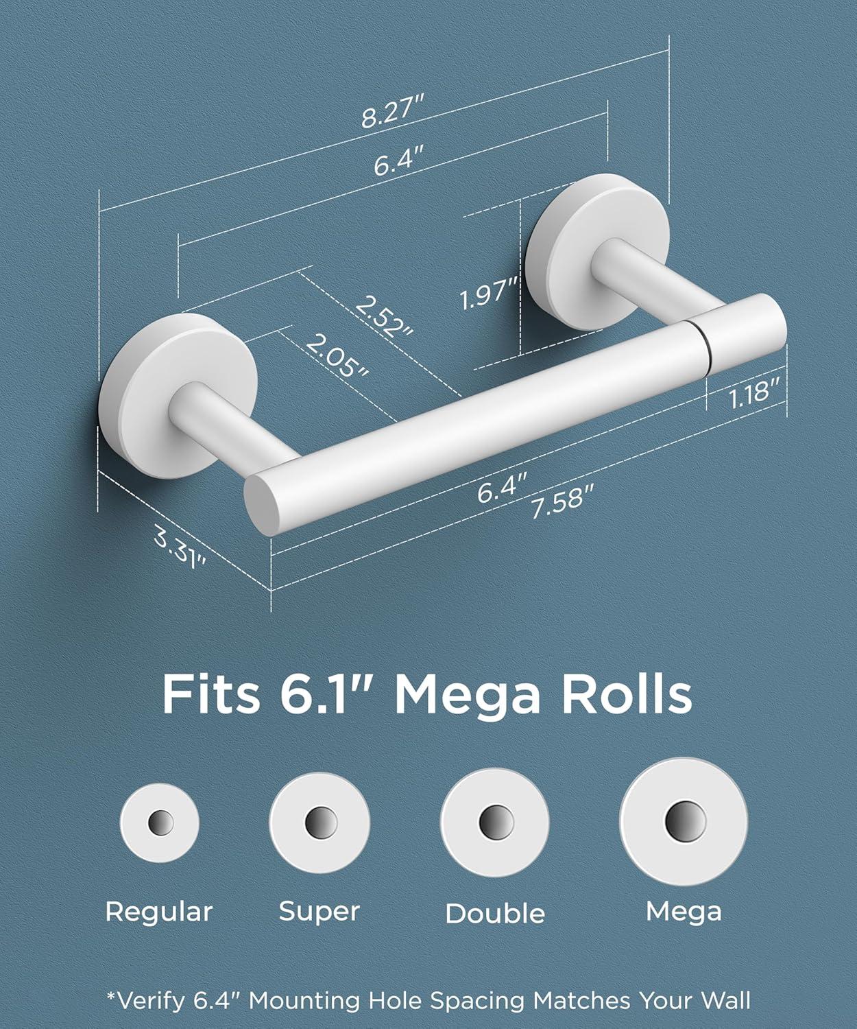 True Size: The gold toilet paper holder can accommodate large rolls with a maximum diameter of 6.1”, sufficient for daily use without being too noticeable, maximizing unused wall space. Note: Not suitable for oversized rolls > 6.1 inches in diameter