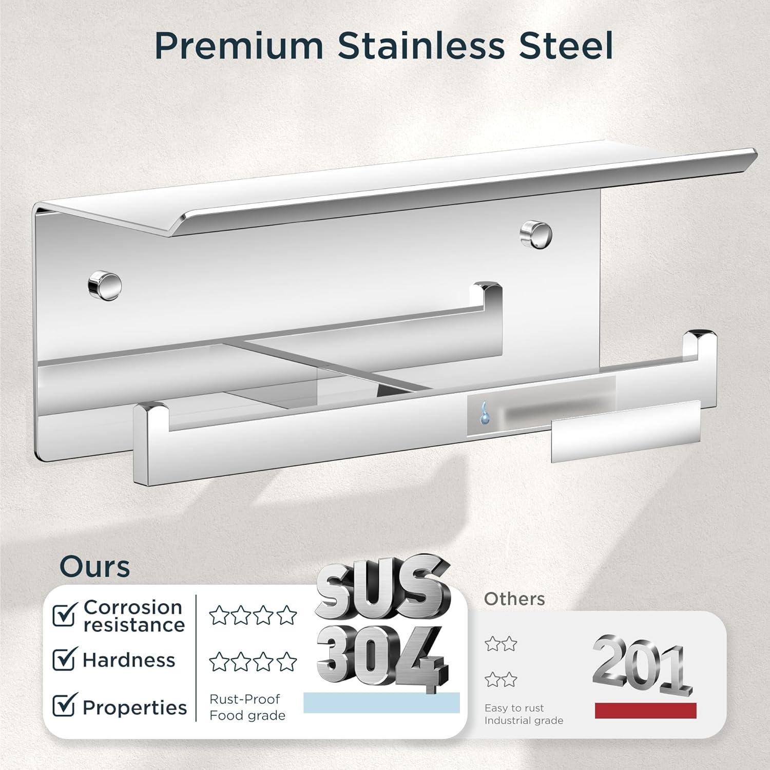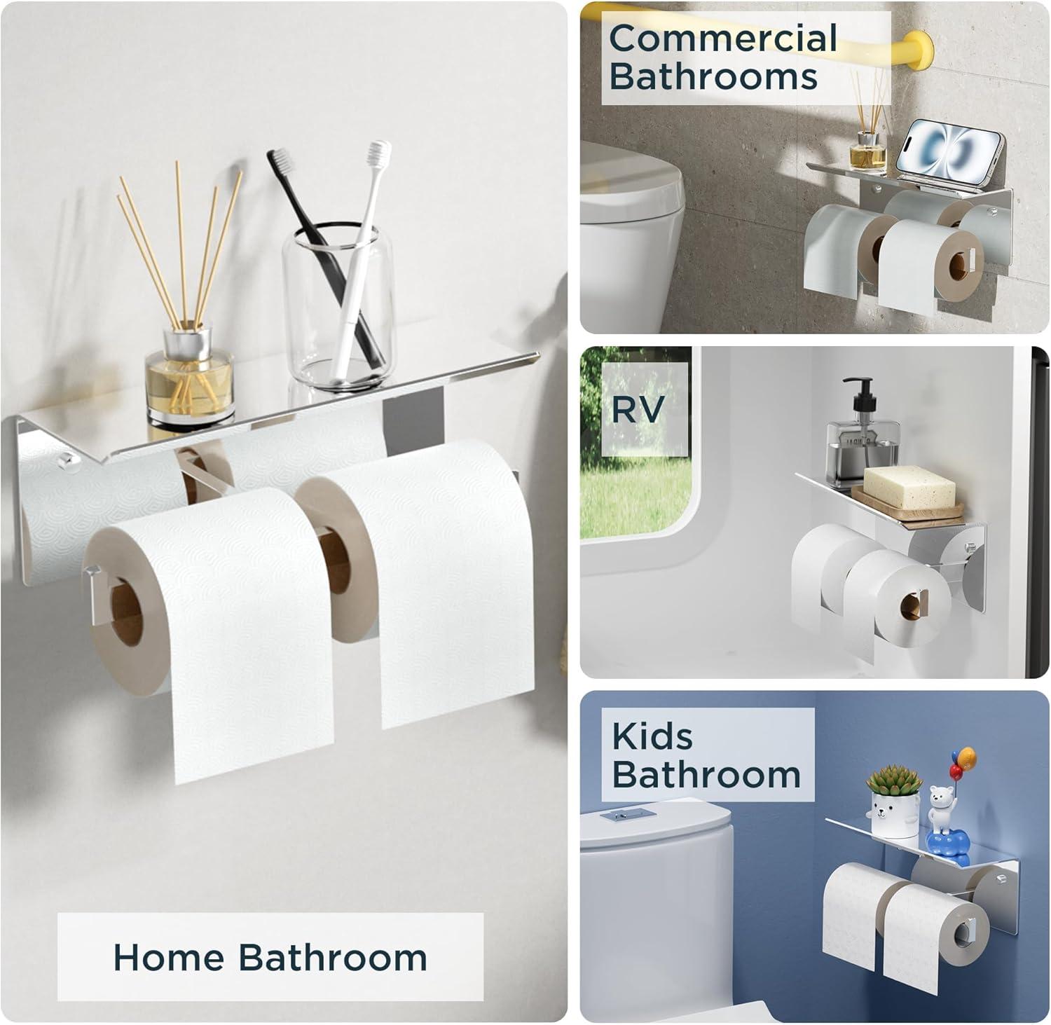 Premium 304 Stainless Steel: Made of SUS304 stainless steel, this double toilet paper holder with phone shelf resists rust, scratches, and fading, ensuring long-lasting durability. Modern and simple design, perfect for home or commercial bathrooms