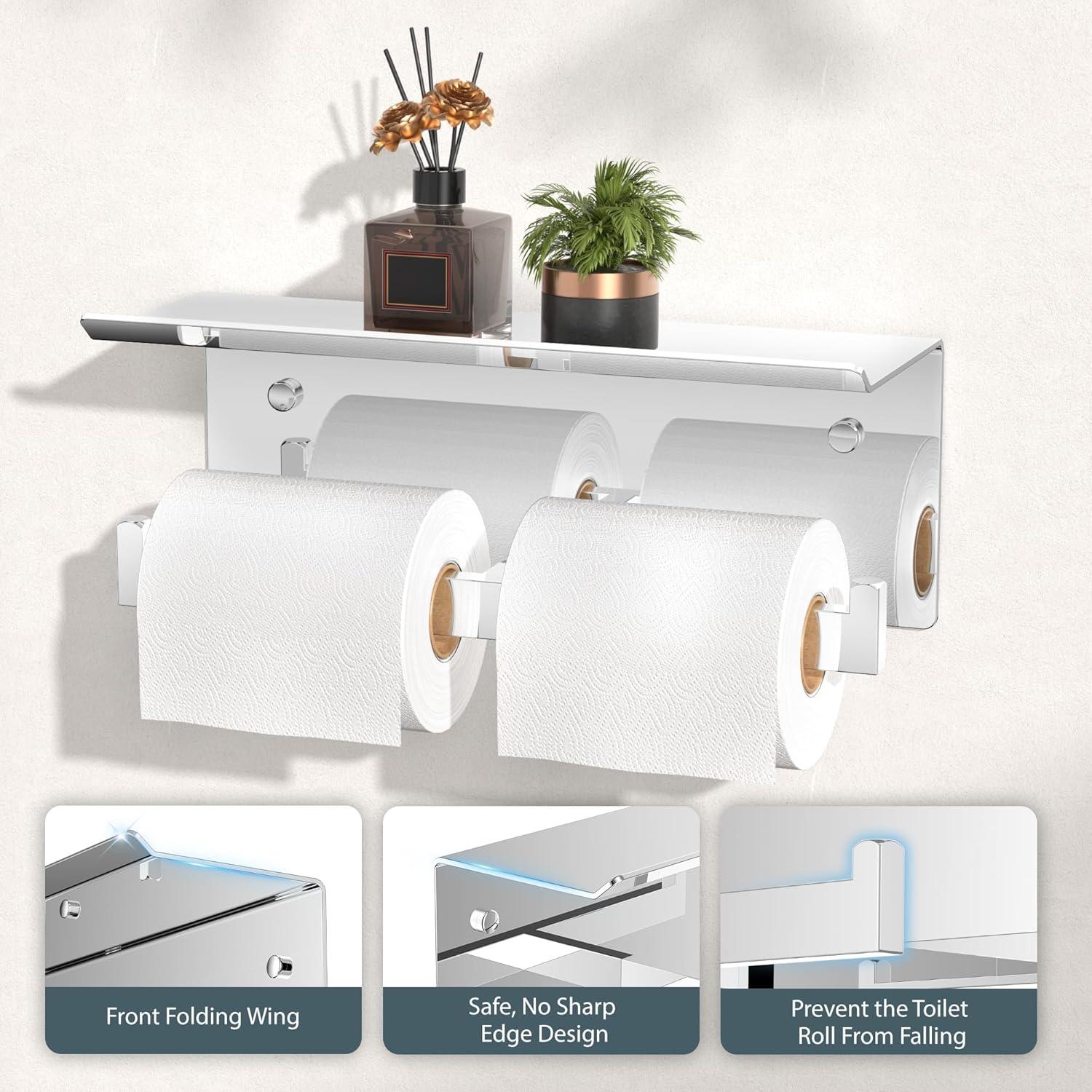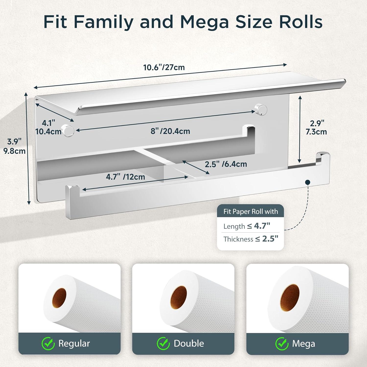 Dual Roll Capacity & Shelf Design: The toilet paper holder wall mount features a spacious shelf for phones, wipes, or small items. With an anti-slip upward baffle design. It can accommodate two large rolls of paper to avoid frequent replacement. Fit paper roll with length ≤ 4.7″, thickness ≤ 2.5″