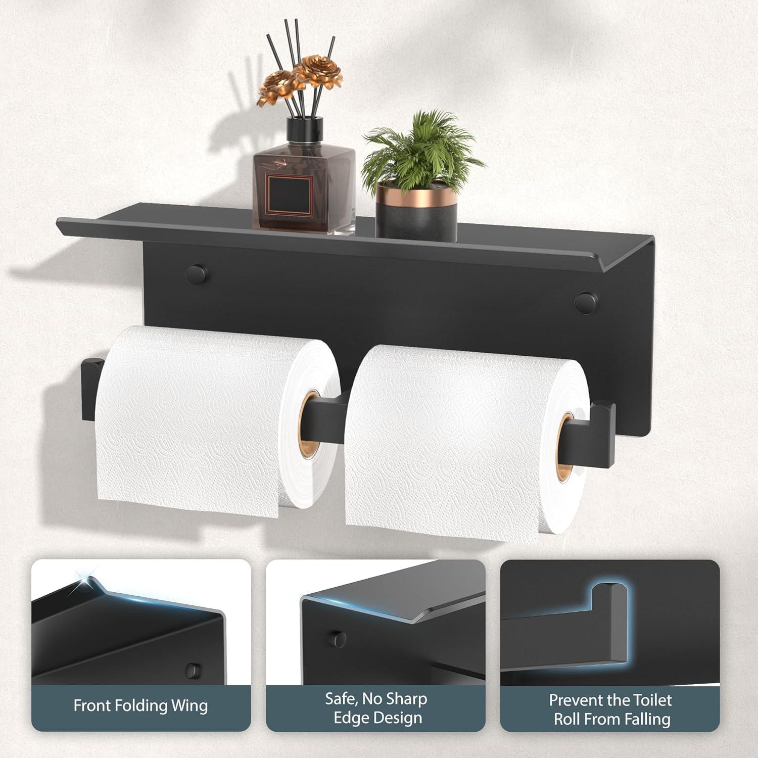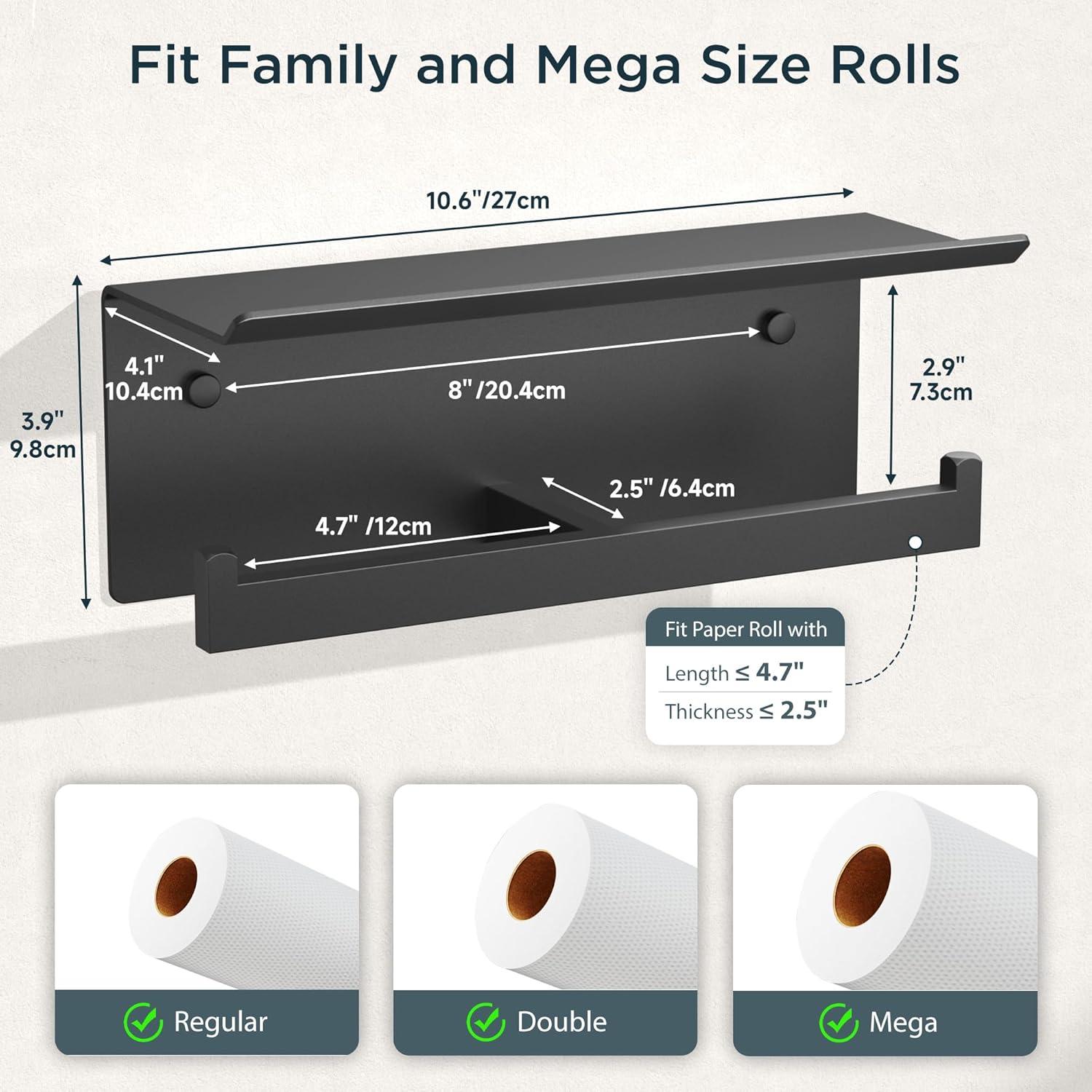 Dual Roll Capacity & Shelf Design: The toilet paper holder wall mount features a spacious shelf for phones, wipes, or small items. With an anti-slip upward baffle design. It can accommodate two large rolls of paper to avoid frequent replacement. Fit paper roll with length ≤ 4.7″, thickness ≤ 2.5″