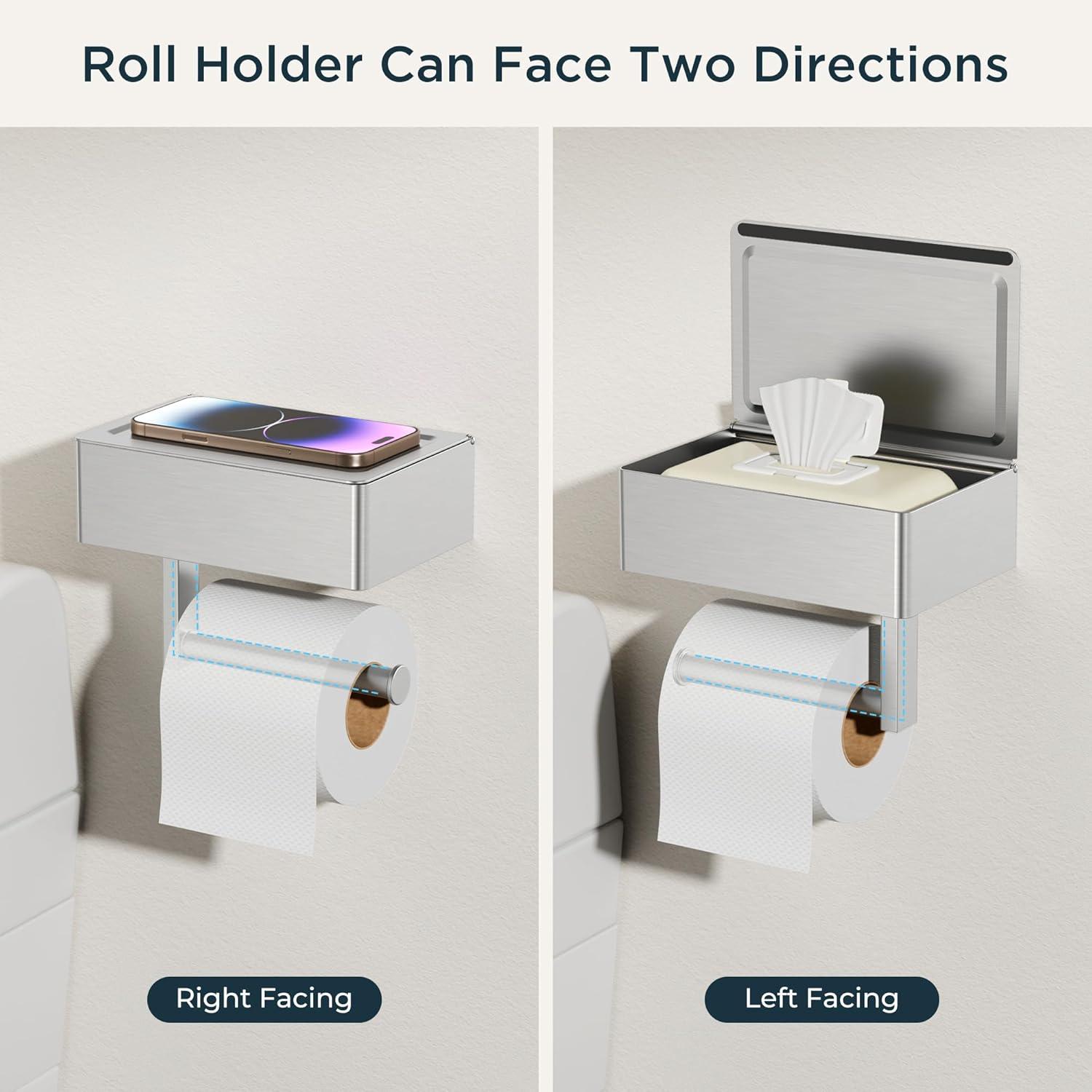 Space-Saving 2-in-1 Design: Efficiently dispenses toilet paper while offering a spacious shelf to securely hold smartphones, tissues, spare rolls, or other small essentials. Ideal for any bathroom—master suite, guest room, or kids’ space