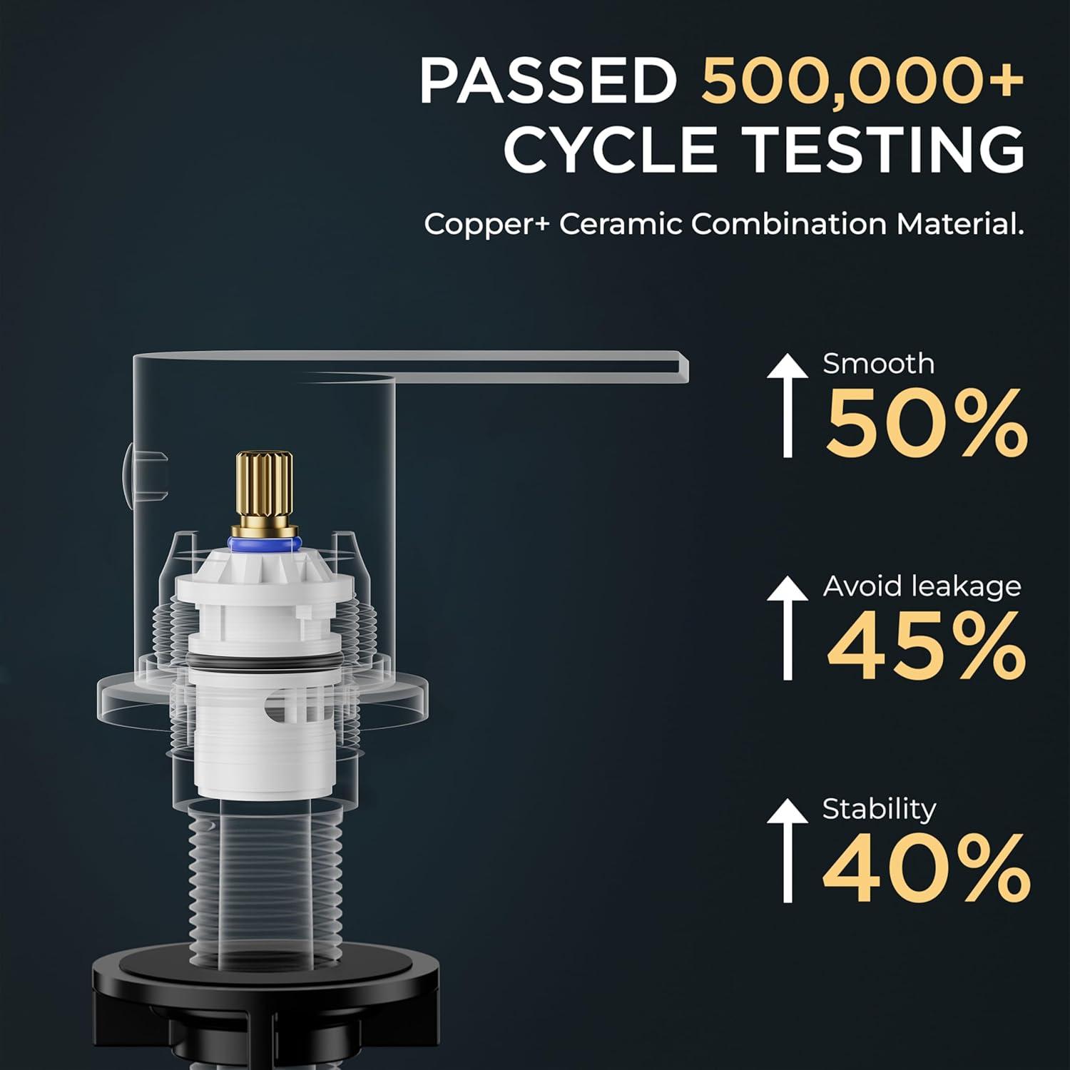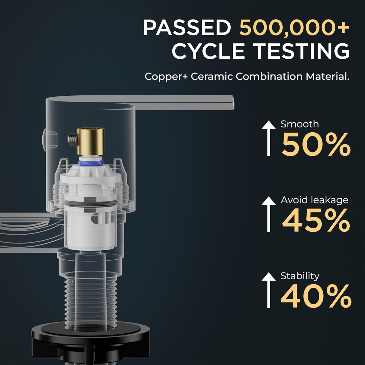 Drip-Free: FORIOUS matte black bathroom faucet featuring a drip-free ceramic cartridge has passed 500,000 cycles of water tightness test, to ensure that the faucet is stable, which is unaffected by temperature extremes, sand, rust, and hard water conditions. Flow rate: 1.2gpm/4.5L/min at Max 60psi