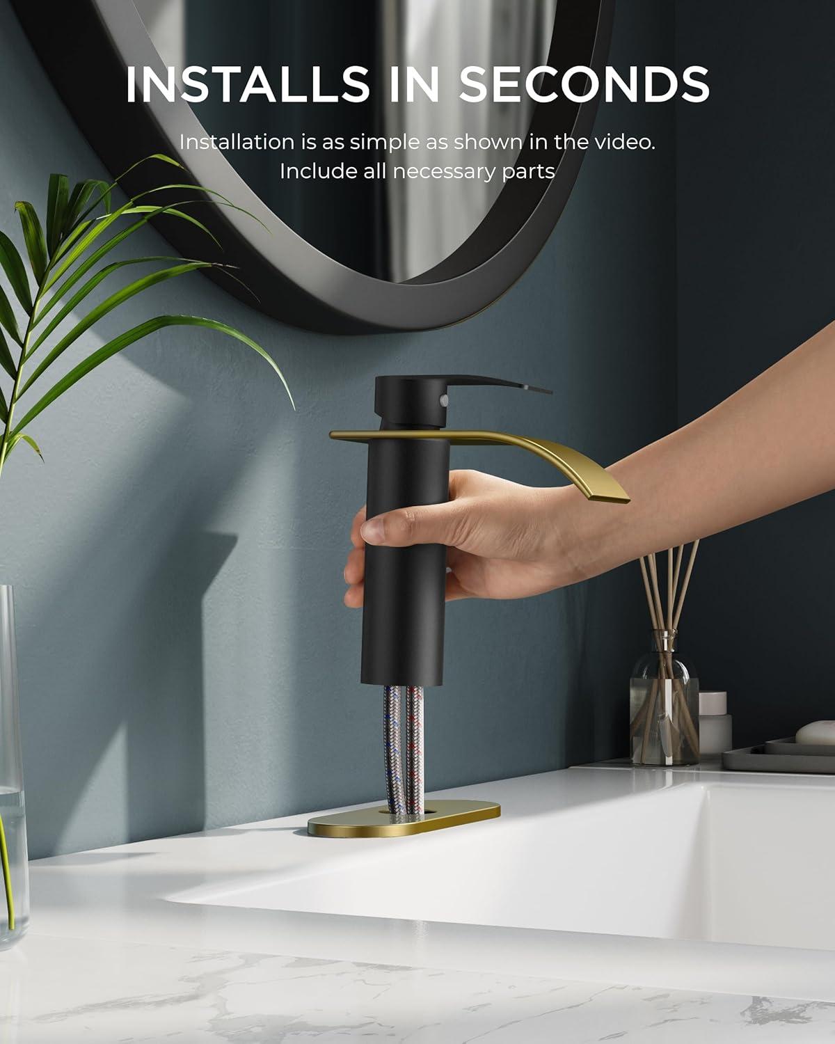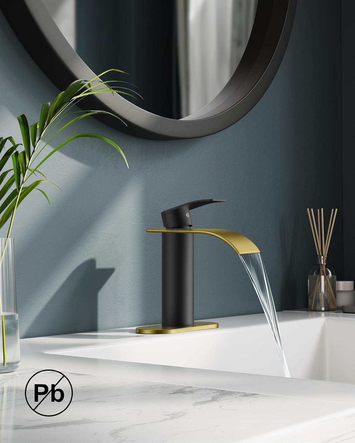Our clearance section features the best deals on FORIOUS Waterfall Bathroom Faucet 1 Hole, Brushed Nickel Single Handle Bathroom Sink Faucets for 1 or 3 Hole with Deck Plate, Metal Pop up Drain, cUPC Hoses for Vanity, Basin, Rv, Lavatory Sink(Black&Gold) and accessories. Check it out now!
