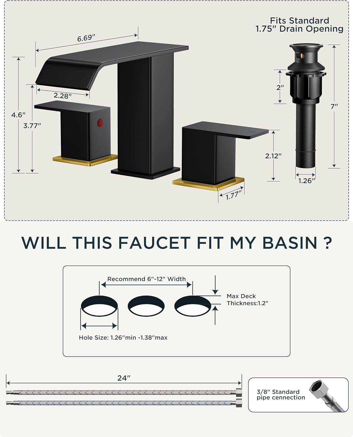 MODERN AESTHETICS: Square waterfall bathroom faucet combines strength and soft beauty, has both modern and natural aesthetics. Suitable for a 3 hole 6-12 inch center sink, and the best installation effect is 6-10 inch. The size is larger, please check your sink hole
