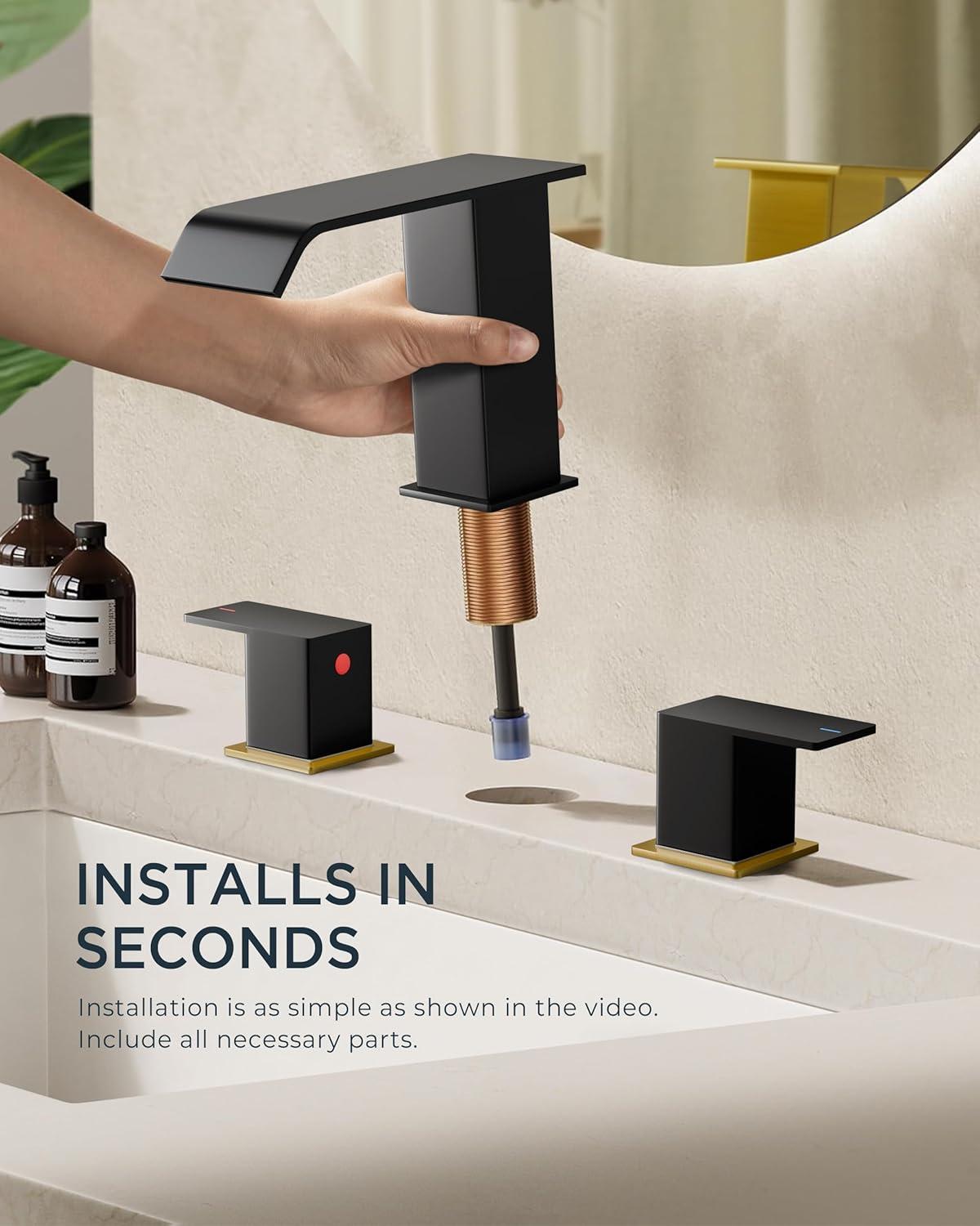 WIDE WATERFALL SPOUT: The spout of this widespread bathroom faucet extends far and has a scientific tilt angle, so you don't have to worry about water backing up onto the countertop or splashing. This bathroom faucet bulit-in sieve can provide water splashing and save 50% from normal faucets.