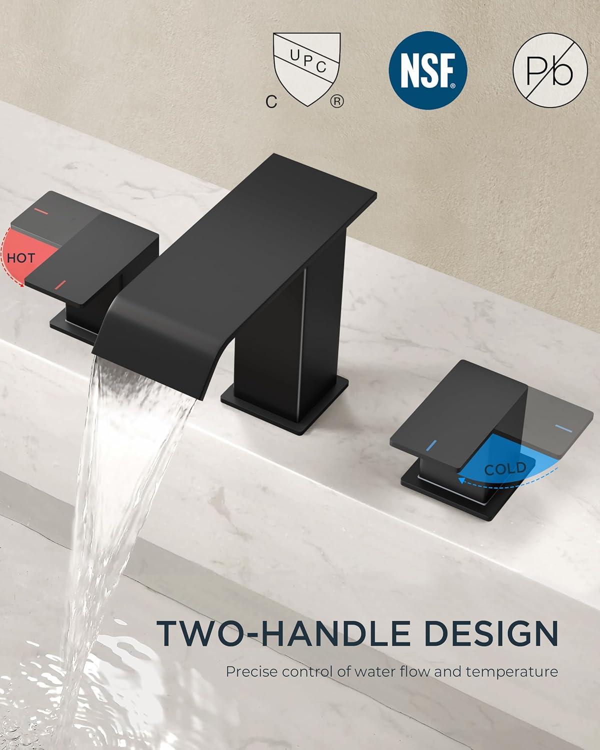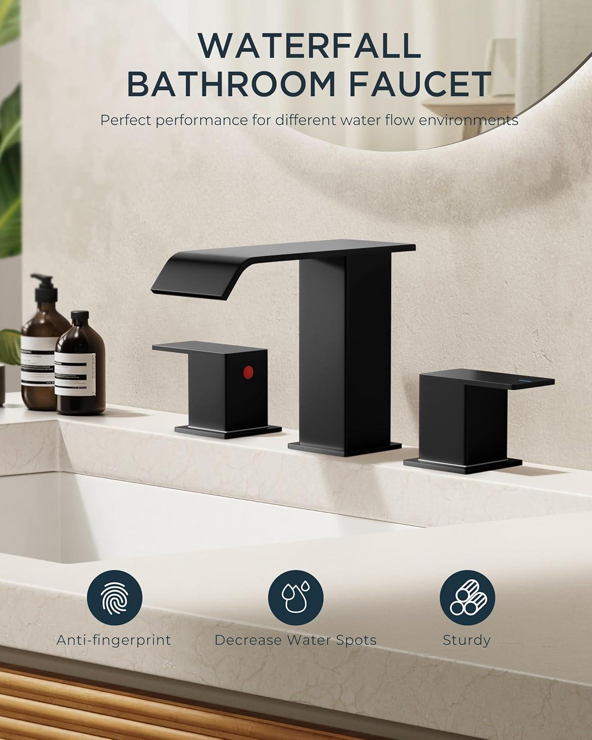 WIDE WATERFALL SPOUT: The spout of this widespread bathroom faucet extends far and has a scientific tilt angle, so you don't have to worry about water backing up onto the countertop or splashing. This bathroom faucet bulit-in sieve can provide water splashing and save 50% from normal faucets.