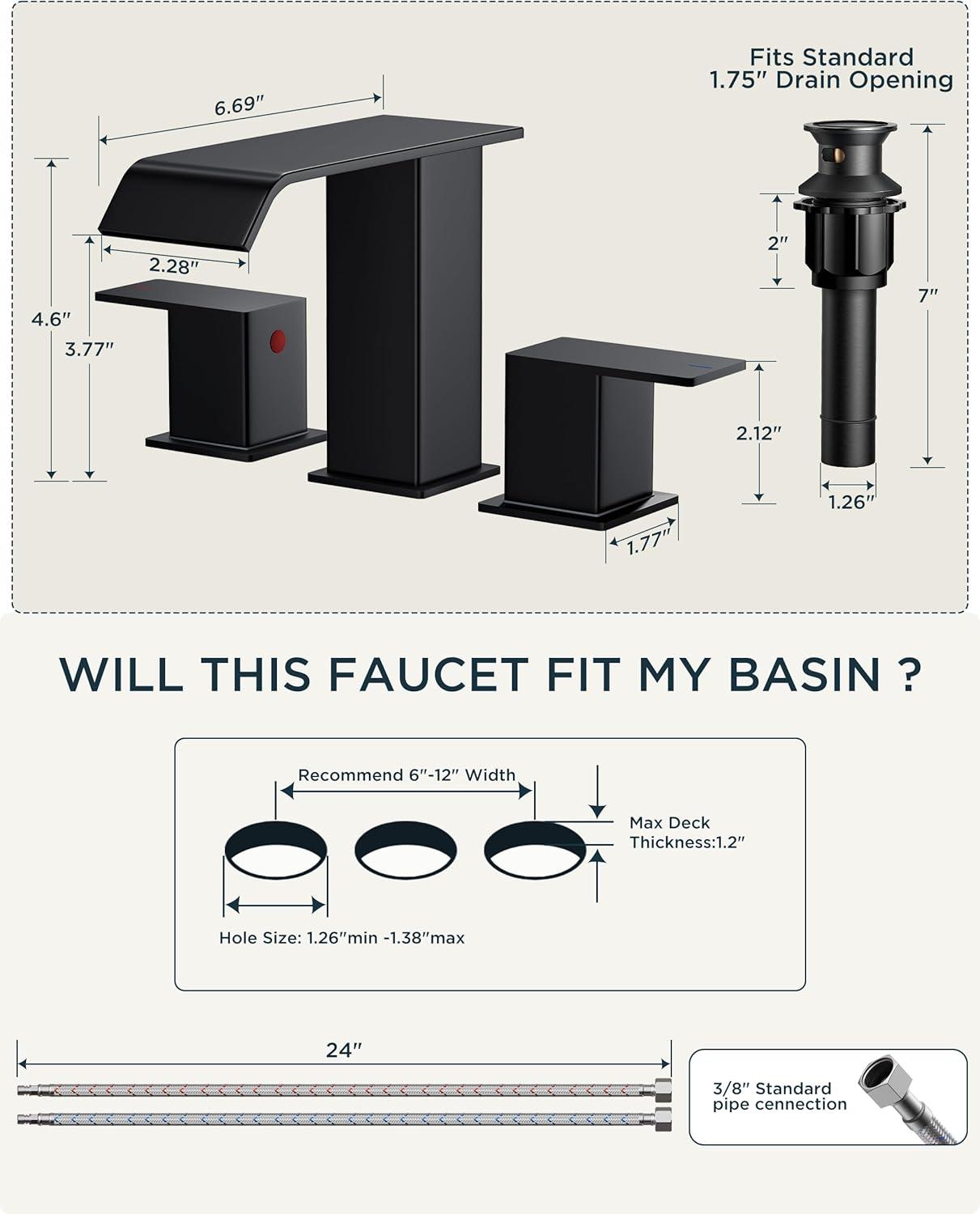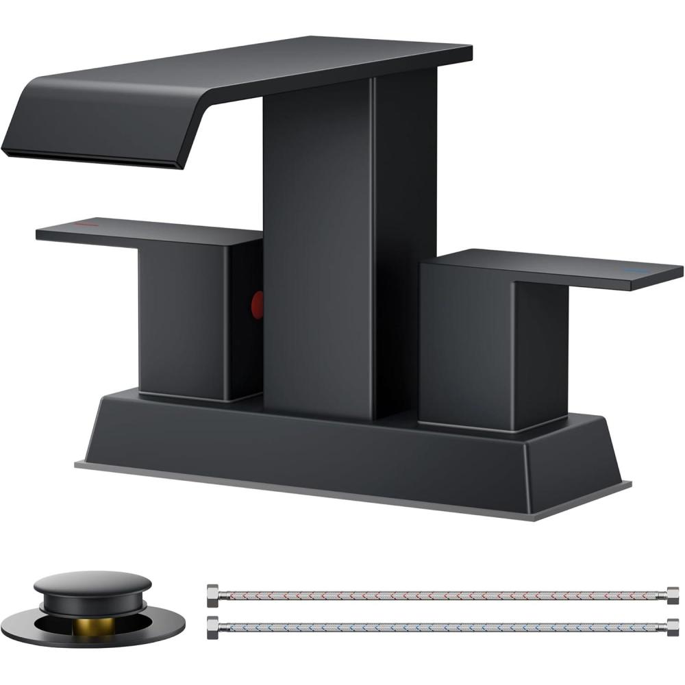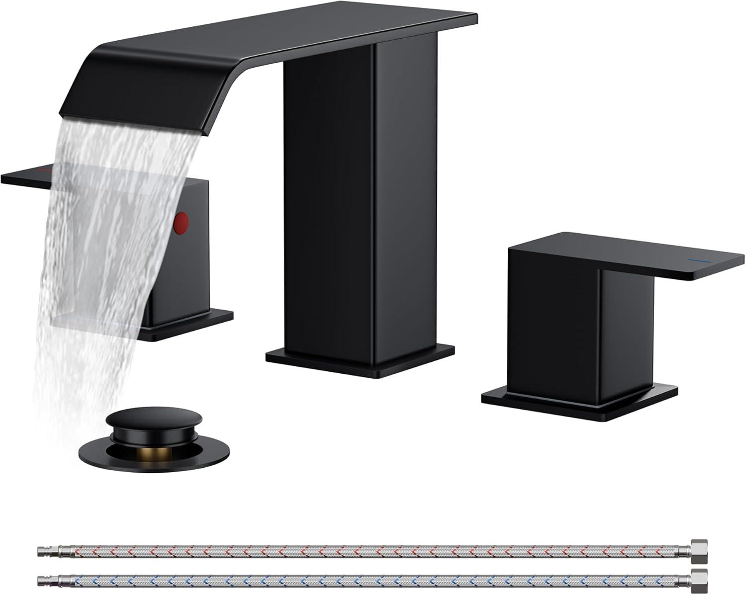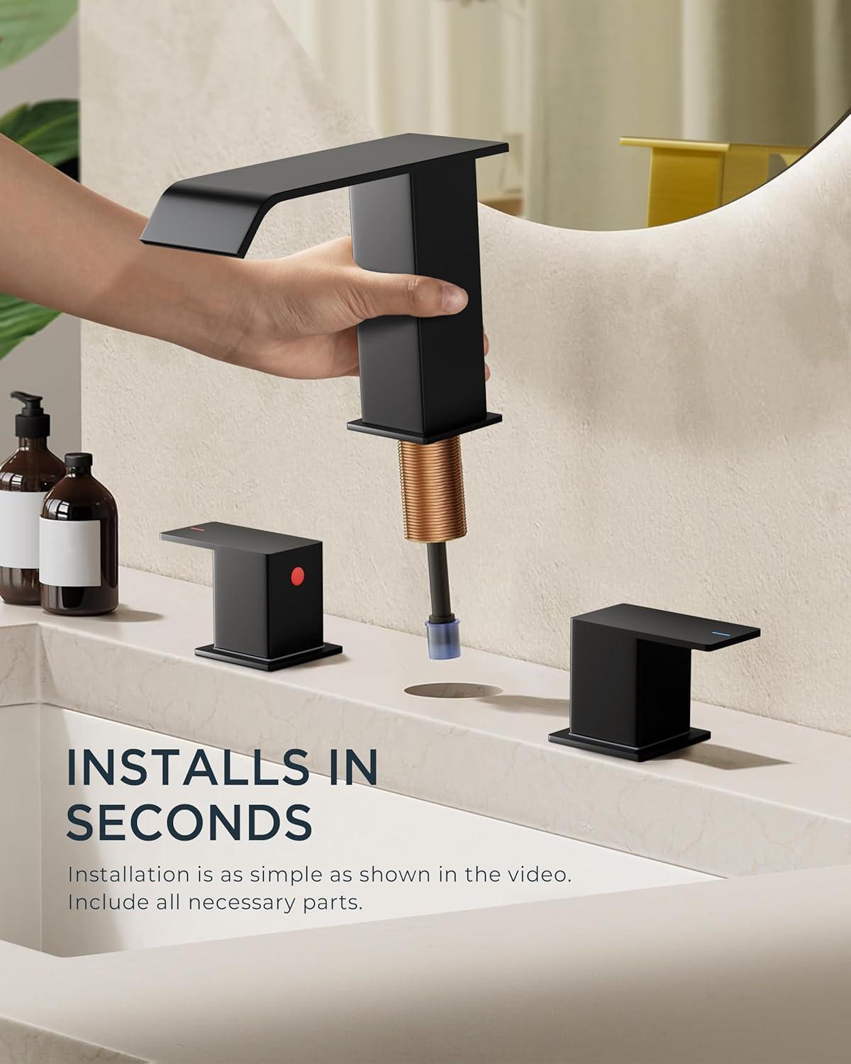 MODERN AESTHETICS: Square waterfall bathroom faucet combines strength and soft beauty, has both modern and natural aesthetics. Suitable for a 3 hole 6-12 inch center sink, and the best installation effect is 6-10 inch. The size is larger, please check your sink hole