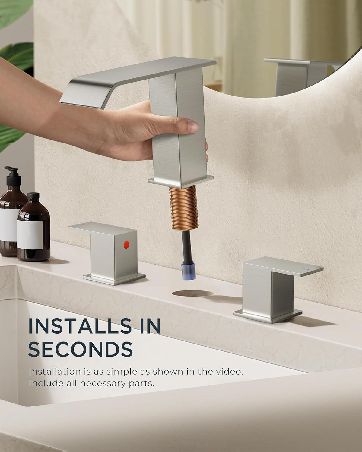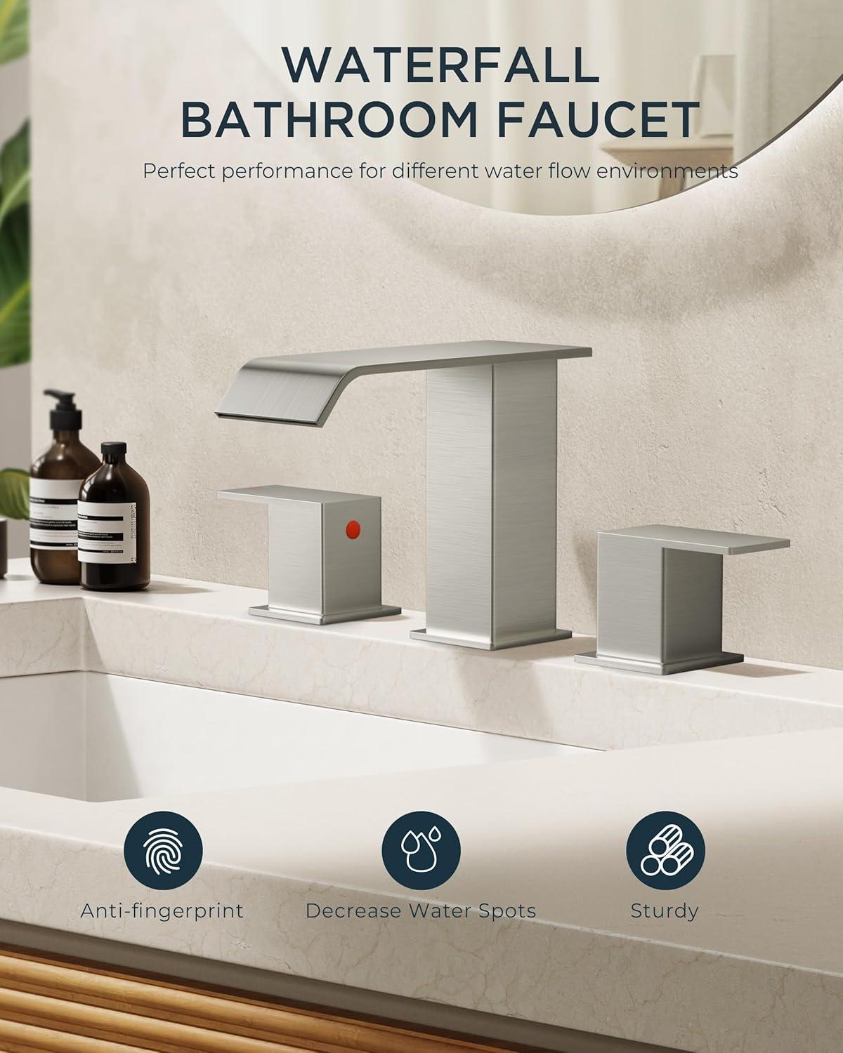 WIDE WATERFALL SPOUT: The spout of this widespread bathroom faucet extends far and has a scientific tilt angle, so you don't have to worry about water backing up onto the countertop or splashing. This bathroom faucet bulit-in sieve can provide water splashing and save 50% from normal faucets.
