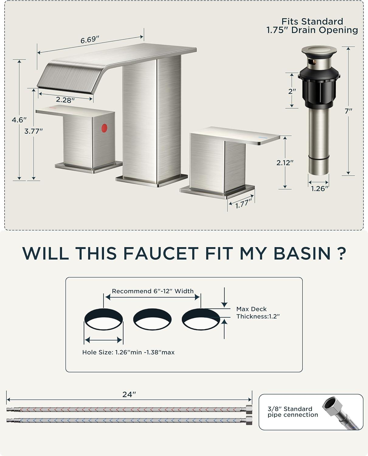 MODERN AESTHETICS: Square waterfall bathroom faucet combines strength and soft beauty, has both modern and natural aesthetics. Suitable for a 3 hole 6-12 inch center sink, and the best installation effect is 6-10 inch. The size is larger, please check your sink hole